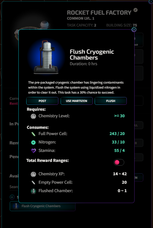 <table><thead><tr><th width="359.66666666666663">Consumes:</th><th width="387.33333333333337">Rewards Per Task</th></tr></thead><tbody><tr><td><img src="https://images.milliononmars.com/eyJidWNrZXQiOiJodHRwIiwia2V5IjoiaHR0cHM6Ly9maXJlYmFzZXN0b3JhZ2UuZ29vZ2xlYXBpcy5jb20vdjAvYi9tb20tcHJvZC02MjVlNS5hcHBzcG90LmNvbS9vL1Jlc2VhcmNoTm9CR3MlMkZSZXNlYXJjaFBhcGVyLnBuZz9hbHQ9bWVkaWEmdG9rZW49MmU1ZTZmZDAtNmRhMy00NjdhLWFmYTgtMzYyOTkxZGNjMTY2IiwiZWRpdHMiOnsicmVzaXplIjp7IndpZHRoIjo2NH19fQ==" alt="Schematic: Ground Control Station" data-size="line">Schematic: Rocket Fuel Factory: 1</td><td>46.5%<img src="https://290879272-files.gitbook.io/~/files/v0/b/gitbook-x-prod.appspot.com/o/spaces%2FRE7Ss7iwx0Rd7OTprzAm%2Fuploads%2FLRluPiD34ctiFkREPMuA%2Fimage.png?alt=media&#x26;token=b2960e4c-4c37-4bc2-abdc-f8325ce5a93f" alt="" data-size="line">Common Rocket Fuel Factory</td></tr><tr><td><img src="https://290879272-files.gitbook.io/~/files/v0/b/gitbook-x-prod.appspot.com/o/spaces%2FRE7Ss7iwx0Rd7OTprzAm%2Fuploads%2Fw8lI6kPHFTI35Sw7JaIm%2Fimage.png?alt=media&#x26;token=2b5feac8-9841-498f-a356-8d90bf8f6d65" alt="" data-size="line">Common Chem Lab (Gen 3): 3</td><td>30%<img src="https://290879272-files.gitbook.io/~/files/v0/b/gitbook-x-prod.appspot.com/o/spaces%2FRE7Ss7iwx0Rd7OTprzAm%2Fuploads%2FgbZtImsglAXzKjtUU1CZ%2Fimage.png?alt=media&#x26;token=984dcb51-7f19-4244-97c6-672020ec04c8" alt="" data-size="line">Uncommon Rocket Fuel Factory</td></tr><tr><td><img src="https://290879272-files.gitbook.io/~/files/v0/b/gitbook-x-prod.appspot.com/o/spaces%2FRE7Ss7iwx0Rd7OTprzAm%2Fuploads%2FdHav7iQuMcalsoAPXu9u%2Fimage.png?alt=media&#x26;token=8ed96a2f-c12c-45b0-beda-ecf8fef7b183" alt="" data-size="line">Common C.A.D. (Gen 3): 3</td><td>15%<img src="https://290879272-files.gitbook.io/~/files/v0/b/gitbook-x-prod.appspot.com/o/spaces%2FRE7Ss7iwx0Rd7OTprzAm%2Fuploads%2FrxG3sO24fnYx9sZaeda5%2Fimage.png?alt=media&#x26;token=b510bab9-51dc-4815-8d24-dfe96dc713d5" alt="" data-size="line">Rare Ground Rocket Fuel Factory</td></tr><tr><td><img src="https://images.milliononmars.com/eyJidWNrZXQiOiJodHRwIiwia2V5IjoiaHR0cHM6Ly9maXJlYmFzZXN0b3JhZ2UuZ29vZ2xlYXBpcy5jb20vdjAvYi9tb20tcHJvZC02MjVlNS5hcHBzcG90LmNvbS9vL1Rva2VucyUyRkdsaXR0ZXJfSWNvbi5wbmc/YWx0PW1lZGlhJnRva2VuPWUyOTYwY2RhLWJiZmYtNGE0My1iMjE5LTkzYzM0ZDg1MTJiNyIsImVkaXRzIjp7InJlc2l6ZSI6eyJ3aWR0aCI6NjR9fX0=" alt="Glitter" data-size="line"> Glitter: 500</td><td>6%<img src="https://290879272-files.gitbook.io/~/files/v0/b/gitbook-x-prod.appspot.com/o/spaces%2FRE7Ss7iwx0Rd7OTprzAm%2Fuploads%2FvLuap7W5QFt9maoLPZmw%2Fimage.png?alt=media&#x26;token=bc0aef14-a3a0-420f-b79f-d6b883425d27" alt="" data-size="line">Epic Ground Rocket Fuel Factory</td></tr><tr><td></td><td>2%<img src="https://290879272-files.gitbook.io/~/files/v0/b/gitbook-x-prod.appspot.com/o/spaces%2FRE7Ss7iwx0Rd7OTprzAm%2Fuploads%2F1AONcUPc5CtKXzPKettZ%2Fimage.png?alt=media&#x26;token=be538e64-a457-42fc-9ef6-1fee8bf0a8ef" alt="" data-size="line">Legendary Rocket Fuel Factory</td></tr><tr><td></td><td>0.5%<img src="https://290879272-files.gitbook.io/~/files/v0/b/gitbook-x-prod.appspot.com/o/spaces%2FRE7Ss7iwx0Rd7OTprzAm%2Fuploads%2FhWbGLefw0miOEywkOumv%2Fimage.png?alt=media&#x26;token=4f3ac08c-db96-4b0b-8989-d38be2bd78be" alt="" data-size="line">Mythic Rocket Fuel Factory</td></tr></tbody></table>
