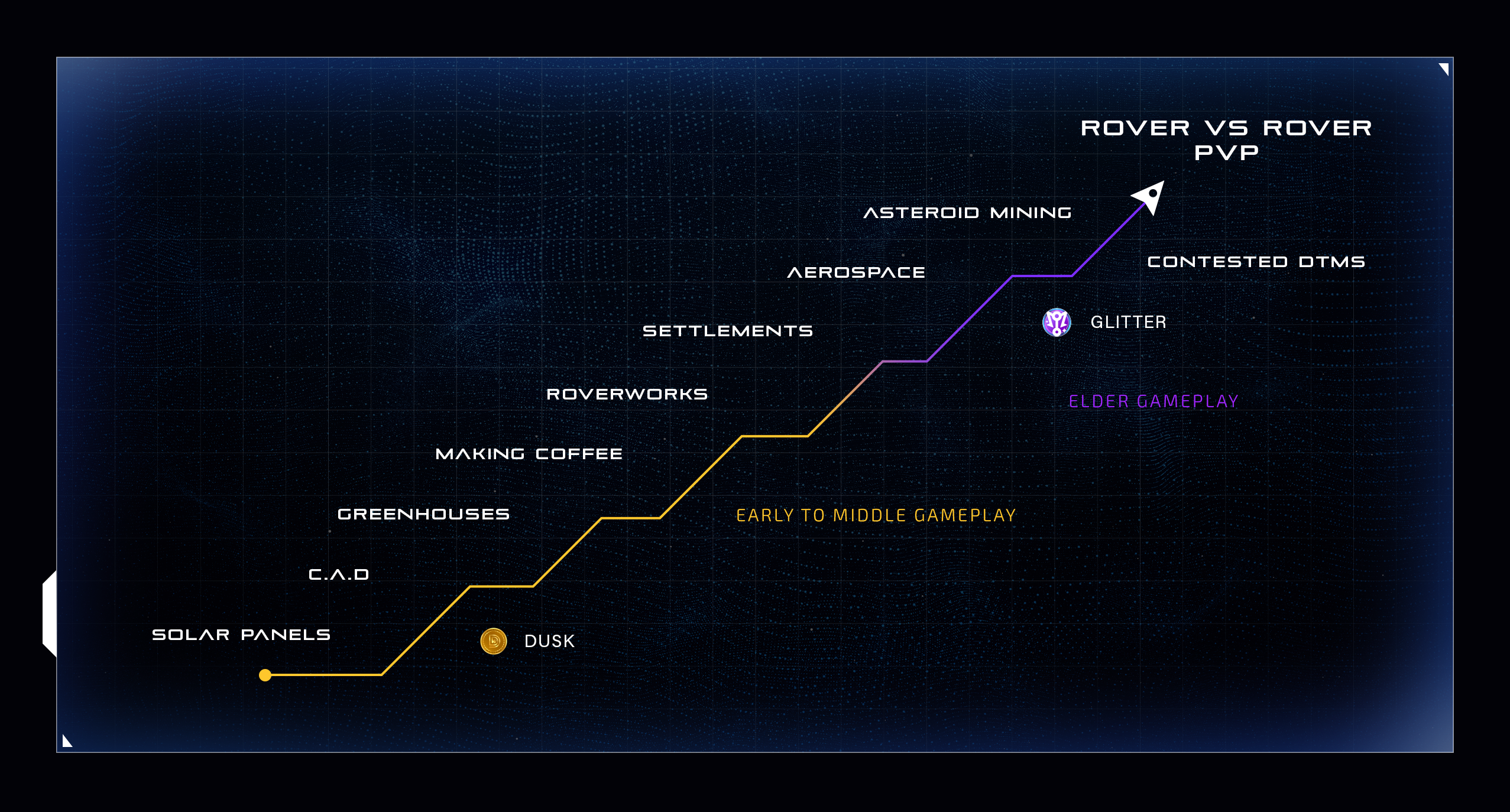 <figure><img src="https://290879272-files.gitbook.io/~/files/v0/b/gitbook-x-prod.appspot.com/o/spaces%2FRE7Ss7iwx0Rd7OTprzAm%2Fuploads%2FB9kR2Uk3zkSWCxNNcOkX%2FDuskandGlitter_Roadmap(Final).png?alt=media&#x26;token=e0127fec-65a0-46a4-b9fb-7190eb5c84e5" alt=""><figcaption><p>Then you will need Dusk and the resources obtained through Dusk to compete and win Glitter for the elder game mechanics.</p></figcaption></figure>